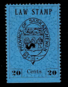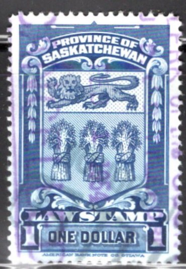 | Saskatchewan provisional law stamp, 20c black on blue, First printing. 'S' punch cancel from law offices or court in Saskatoon. Lovely stamp, from position 23 in a sheet of 25 stamps. | $15.00 | Canada | van Dam SL3 | $35.00 | VF - Superb | Dave Hannay |