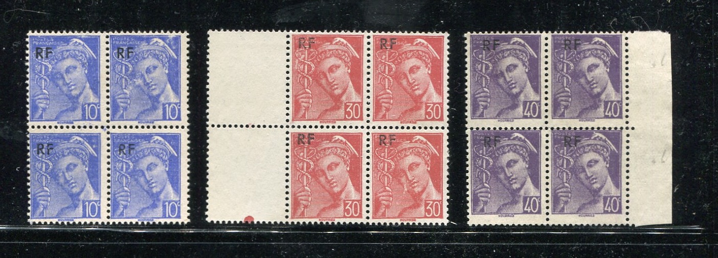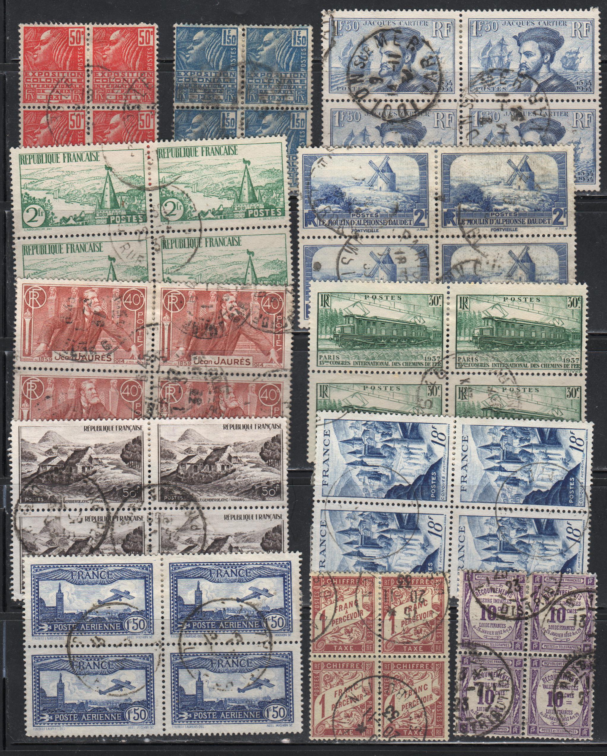 | France, 12 used blocks of four: 260, 261, 297 / 299, 307 / 313, 327 / 632, 593 / C6, J41, J47.