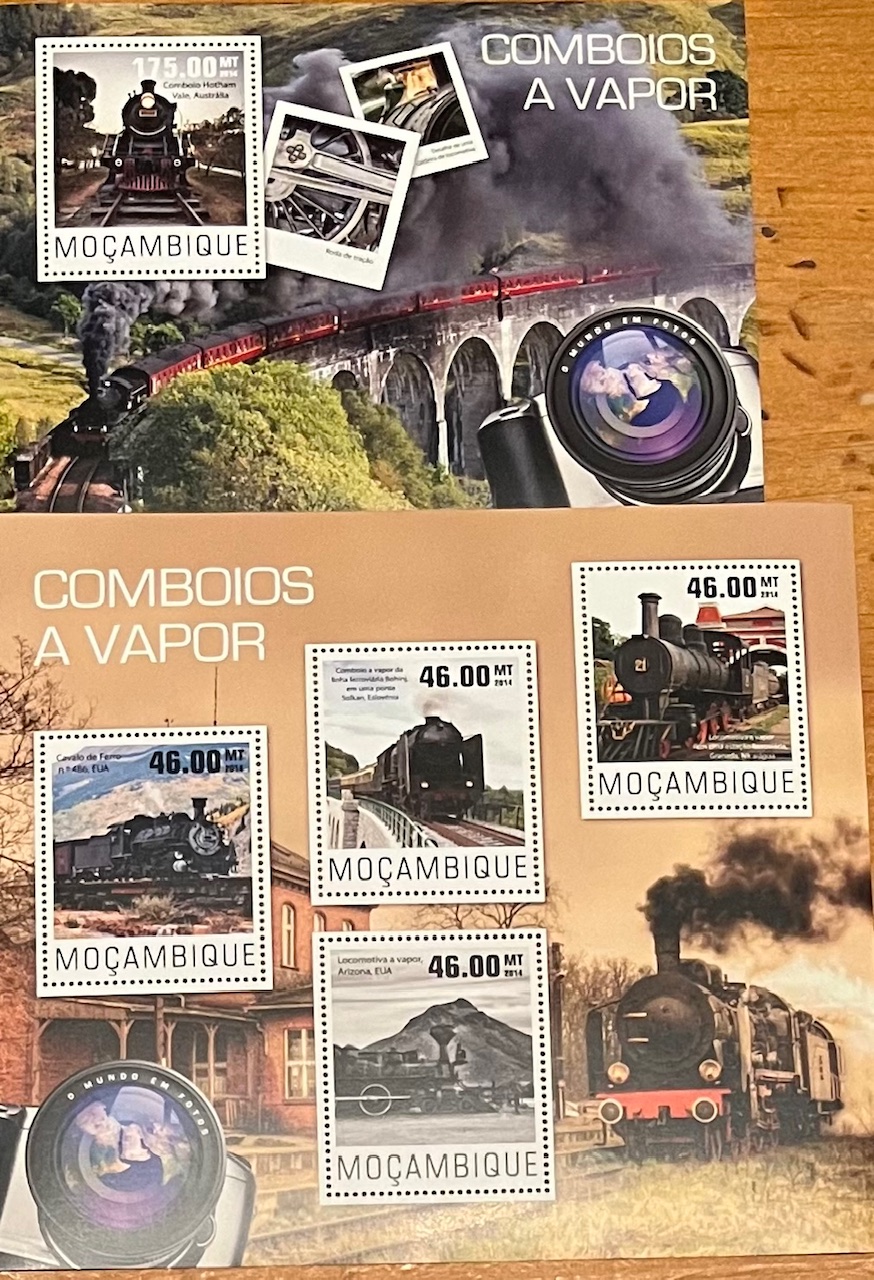 | Mozambique 2 souvenir sheets trains mnh | $2.00 | Mozambique | | | mnh fine | Geoff Solway |
