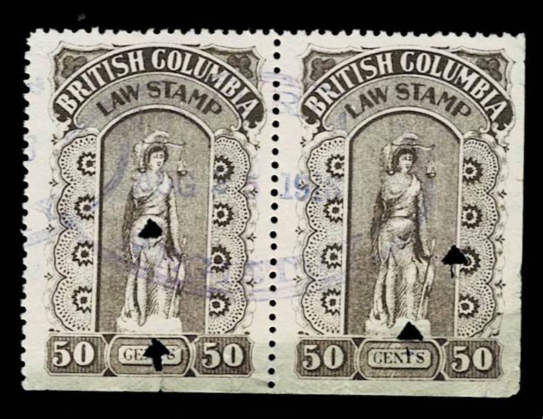 | British Columbia 1905 Series law stamps, joined pair BCL20 50c brown.