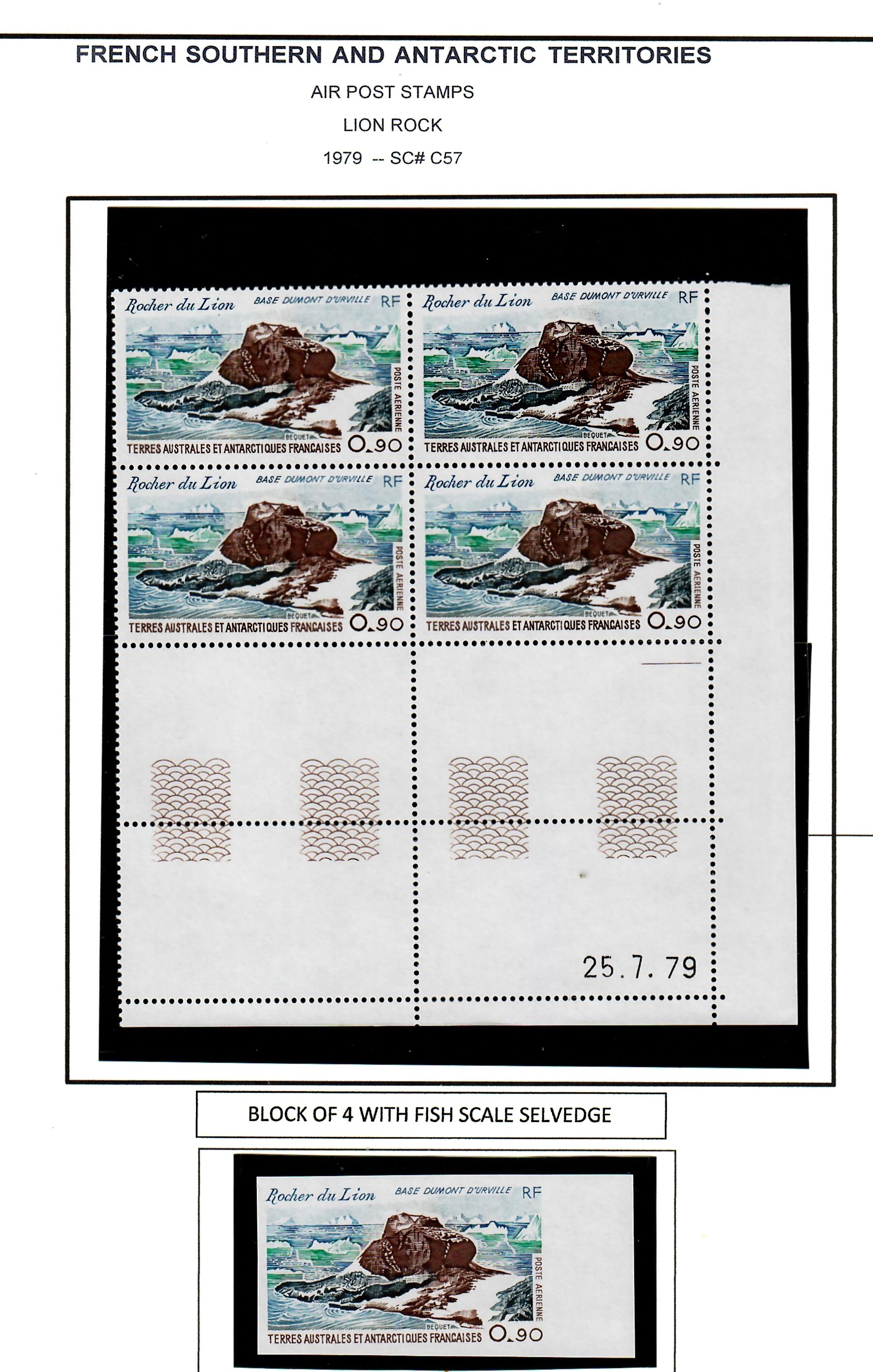 | FRENCH SOUTHERN & ANTARTIC TERRITORY - SC# C57 - LION ROCK -BLOCK OF 4 WITH FISH SCALE SELVAGE & THE IMPERF SINGLE