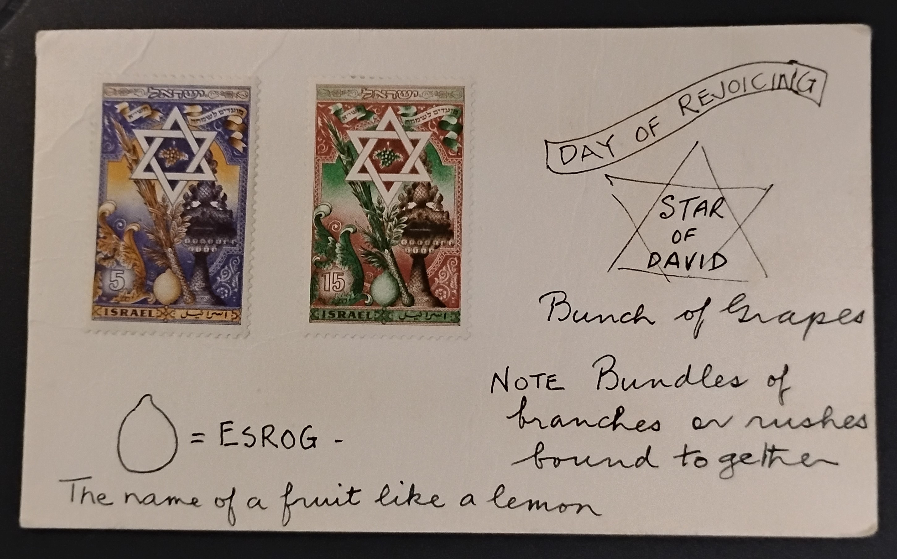 | Small card (abt. 3" x 4") with 2 stamps from Israel with handwritten descriptions of items found on the stamps | $1.00 | Israel | | $0.00 | Very Good | Diane Jarvis |